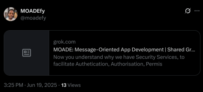 19 June 2025... You can now follow (at https://x.com/moadefy) and participate in our MOADE Operating System development with Grok at https://grok.com/share/bGVnYWN5_786db88a-08cc-421d-bd06-ee789c021586...